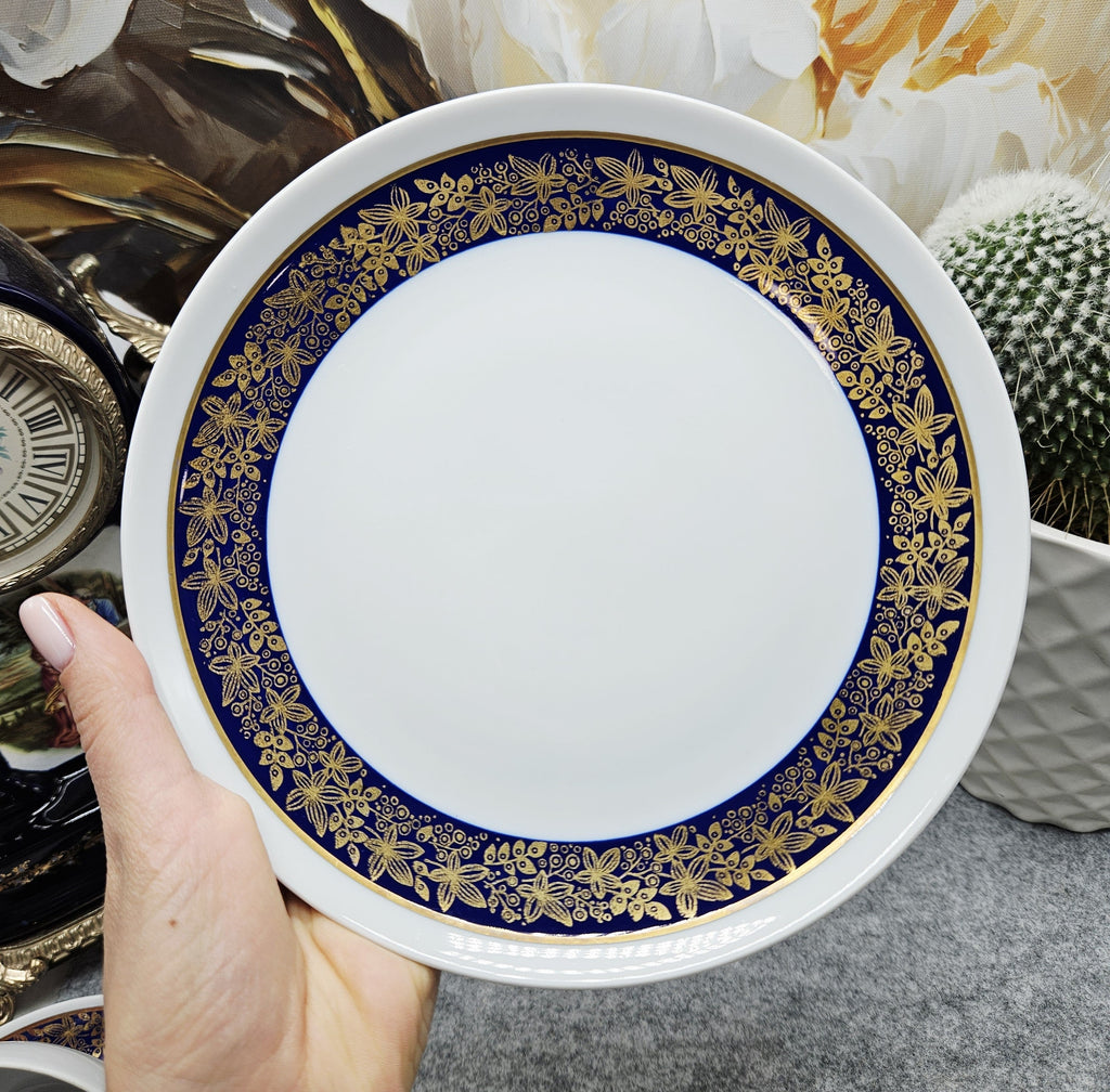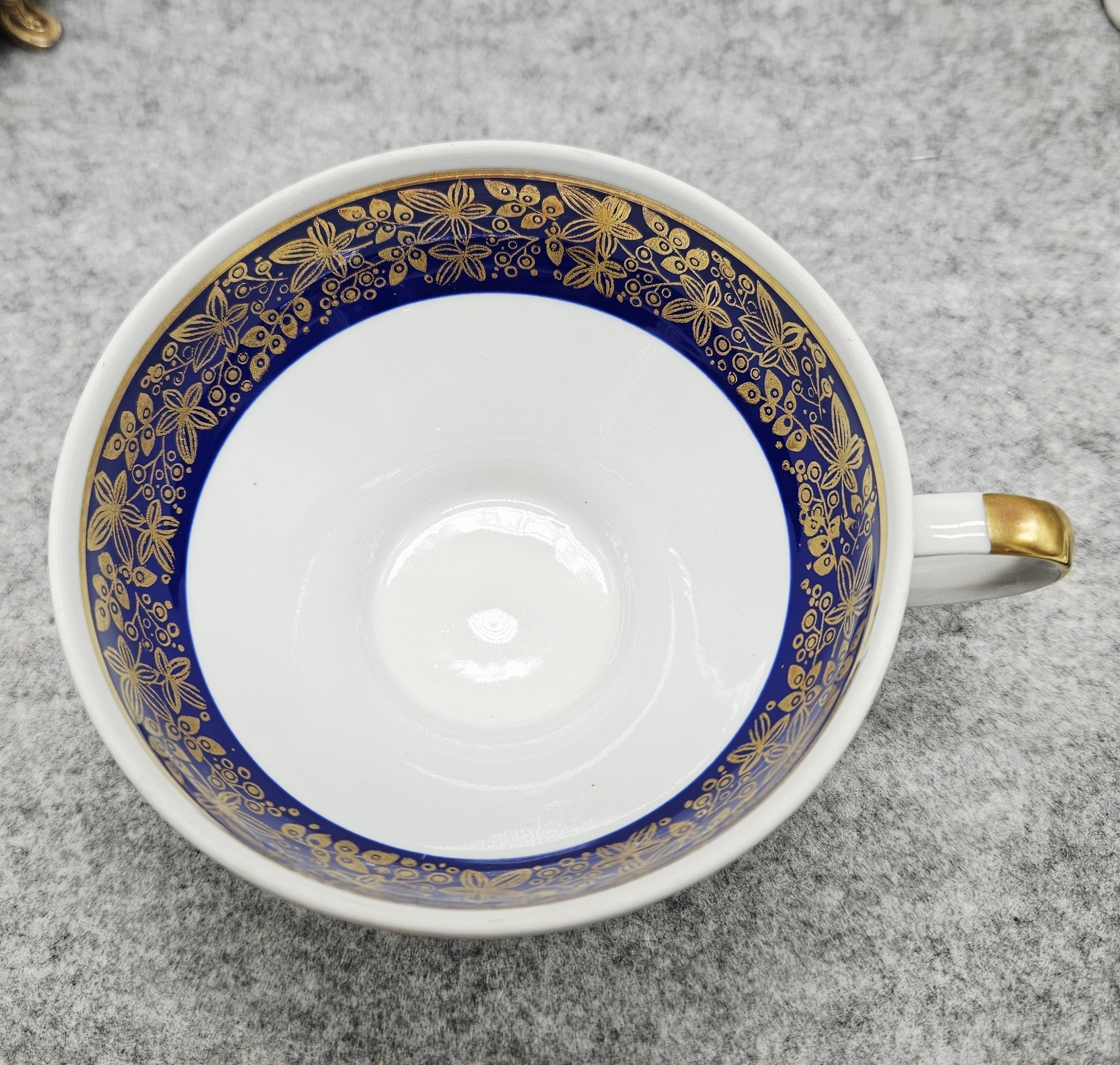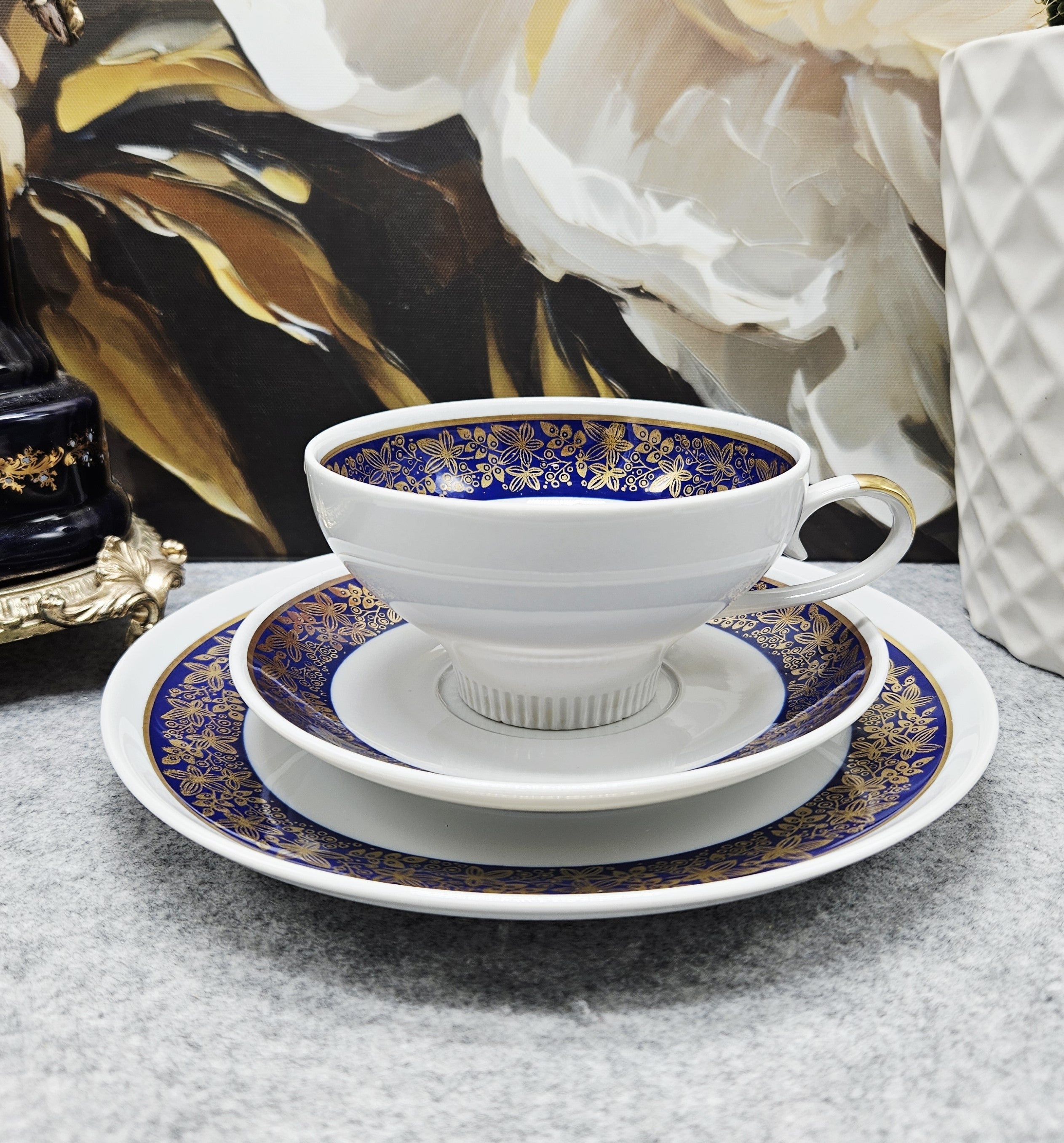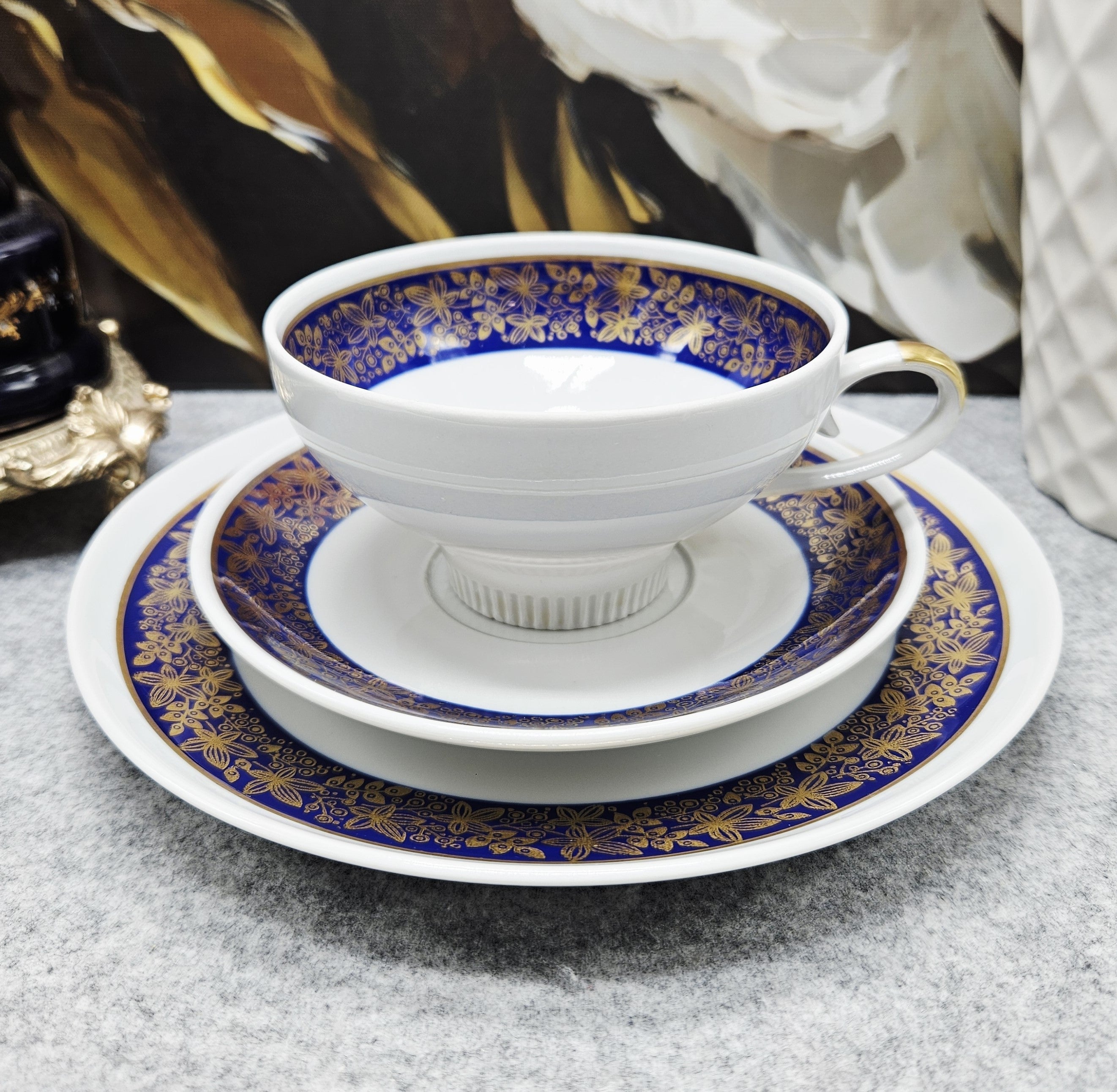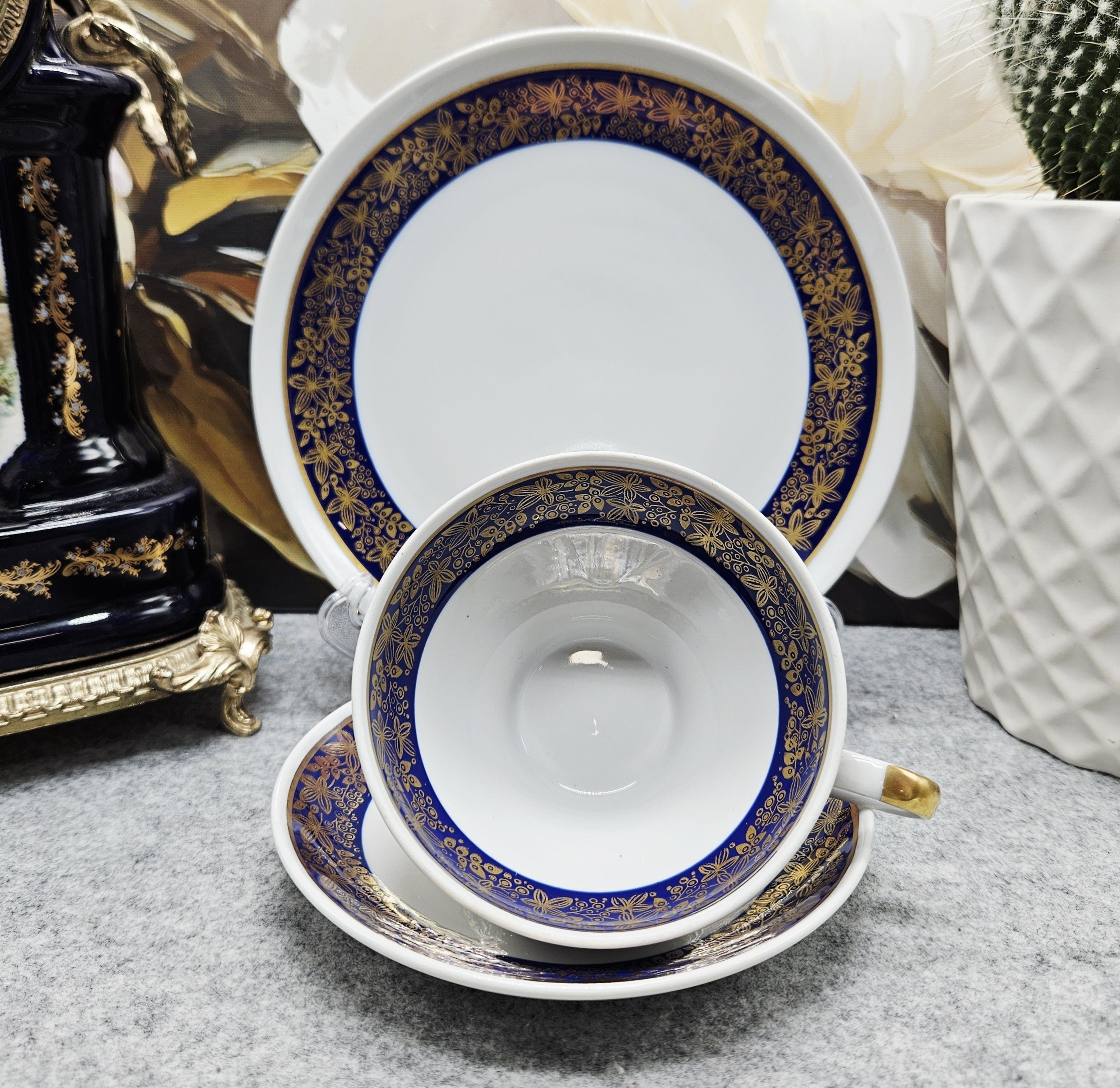 Ein wunderschönes Trio aus einer Tasse und 2 Untertassen, dekoriert mit einer reichen blauen Linie und goldenen Blumen- und Blattmotiven.