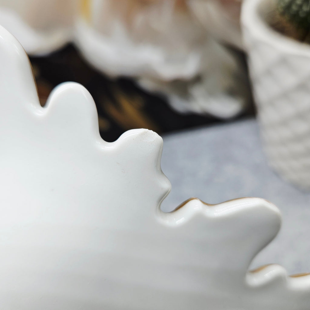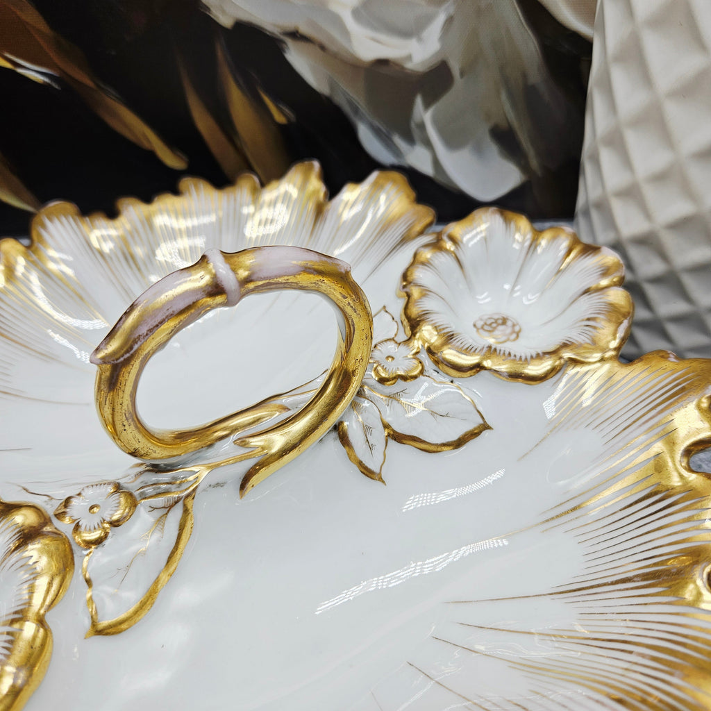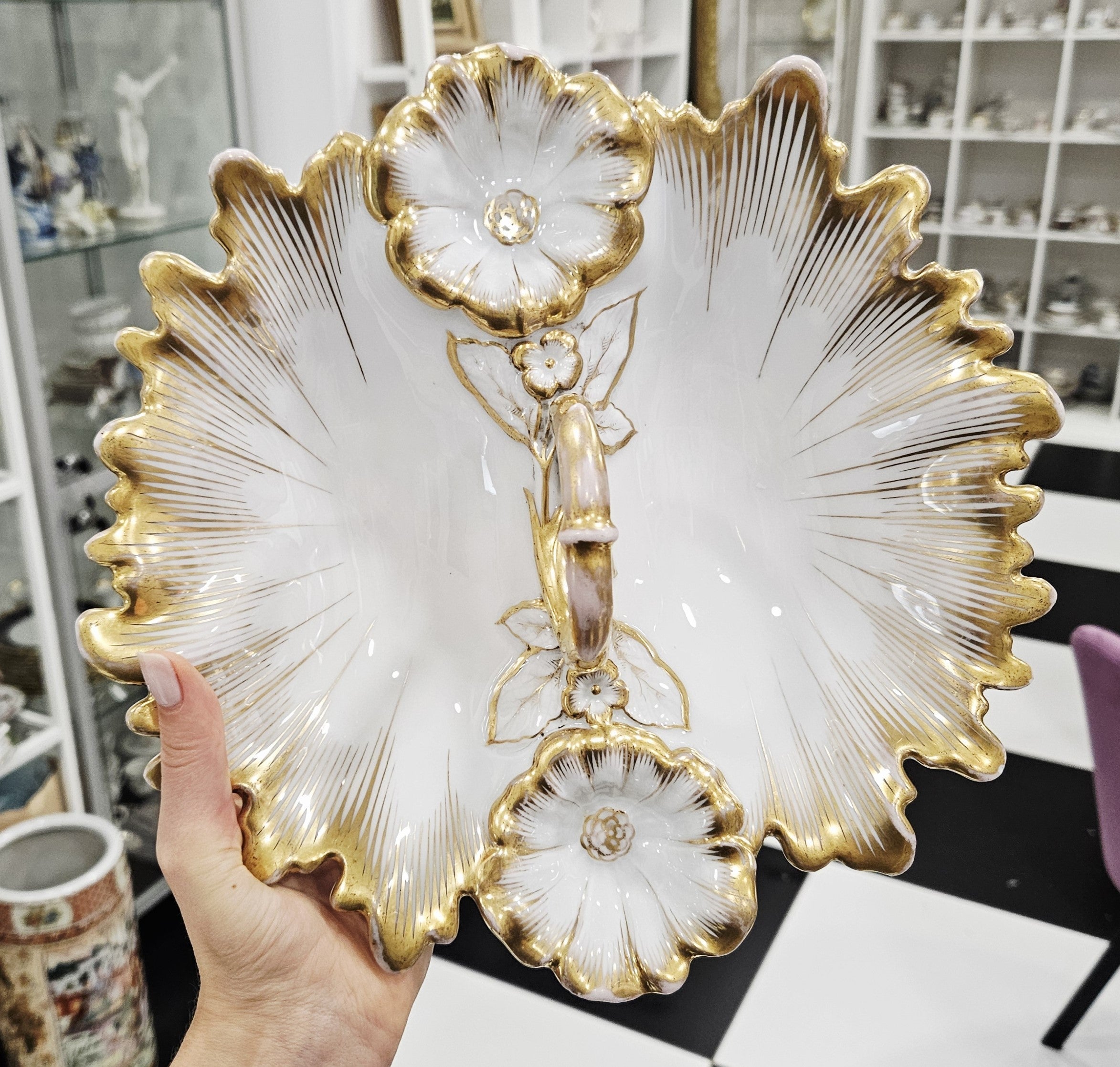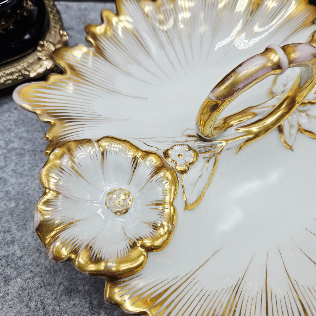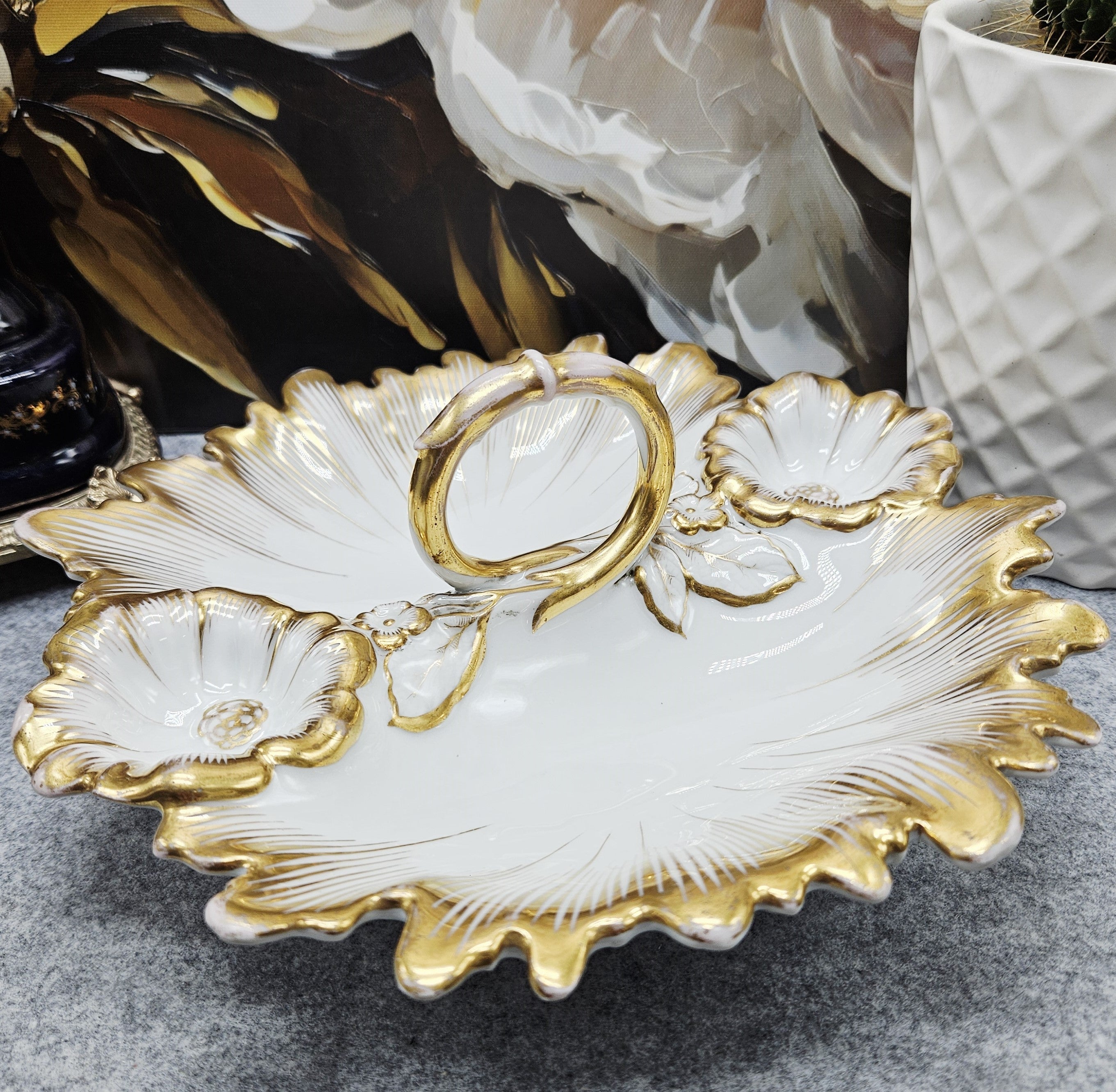 Die Form des Tellers ähnelt einer stilisierten Blüte, und der goldene Henkel mit Blattmotiven in der Mitte verleiht dem Stück ein luxuriöses und funktionelles Aussehen. Solche Stücke wurden verwendet, um bei festlichen Anlässen Desserts, Süßigkeiten oder Obst zu servieren.