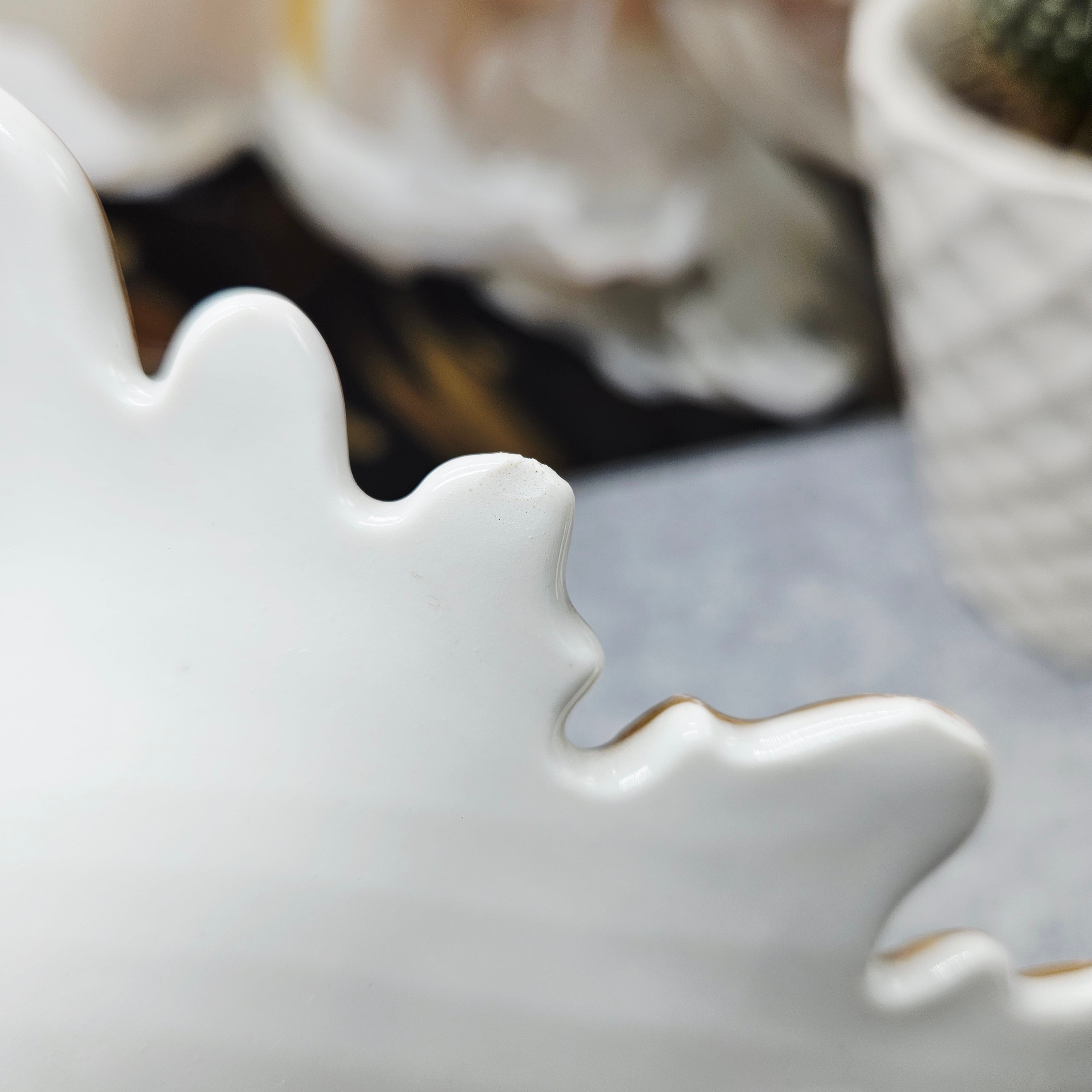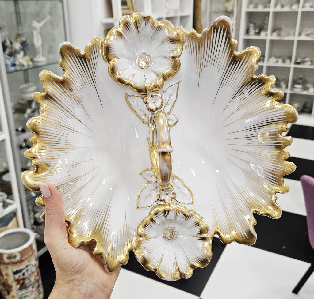 Die Form des Tellers ähnelt einer stilisierten Blüte, und der goldene Henkel mit Blattmotiven in der Mitte verleiht dem Stück eine luxuriöse und funktionelle Note. Solche Stücke wurden verwendet, um bei festlichen Anlässen Desserts, Süßigkeiten oder Obst zu servieren.