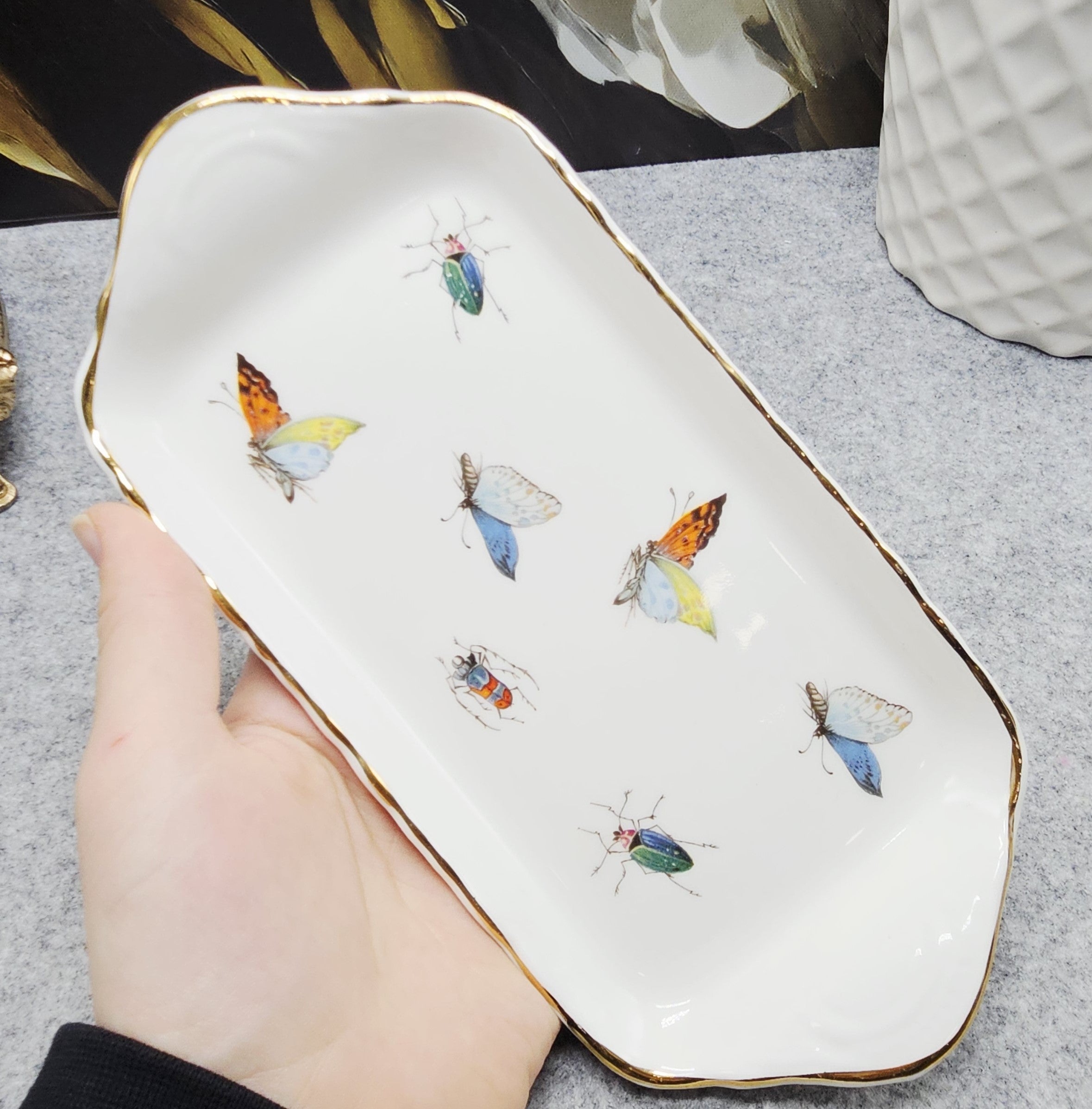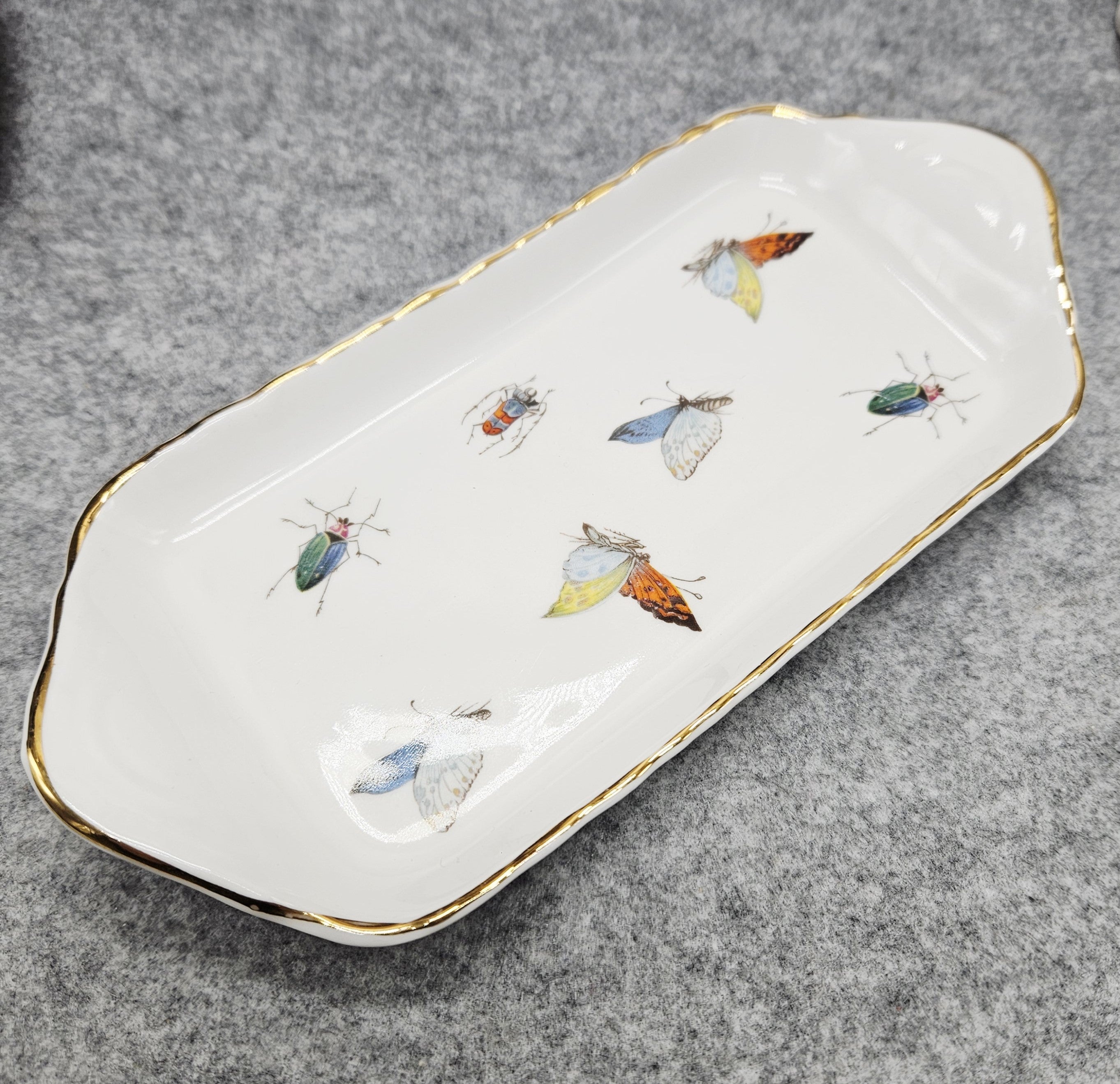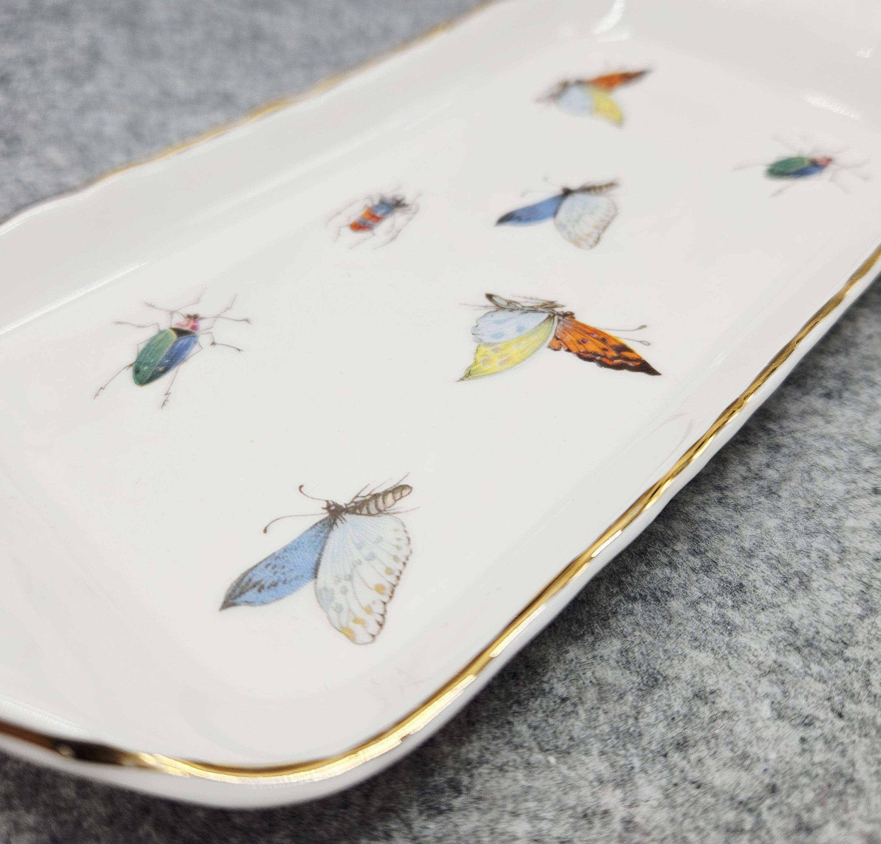 Dieser Untersetzer ist eine echte Kombination aus Minimalismus und Verspieltheit. Verziert mit farbenfrohen Schmetterlingen und Käfern und einer zarten Goldlinie wird er zu einem auffälligen Akzent für Ihr Interieur oder Ihre festliche Tafel.