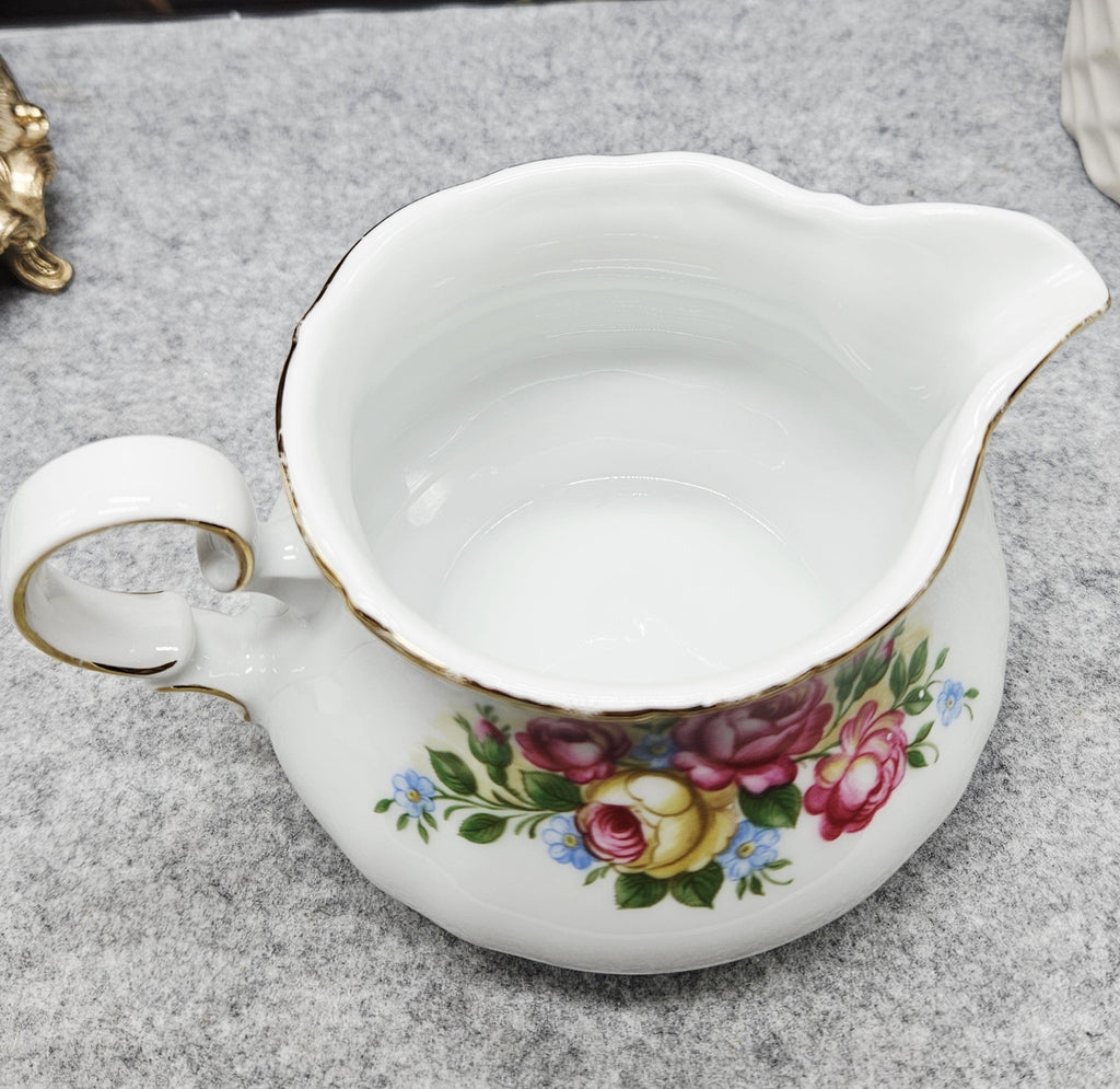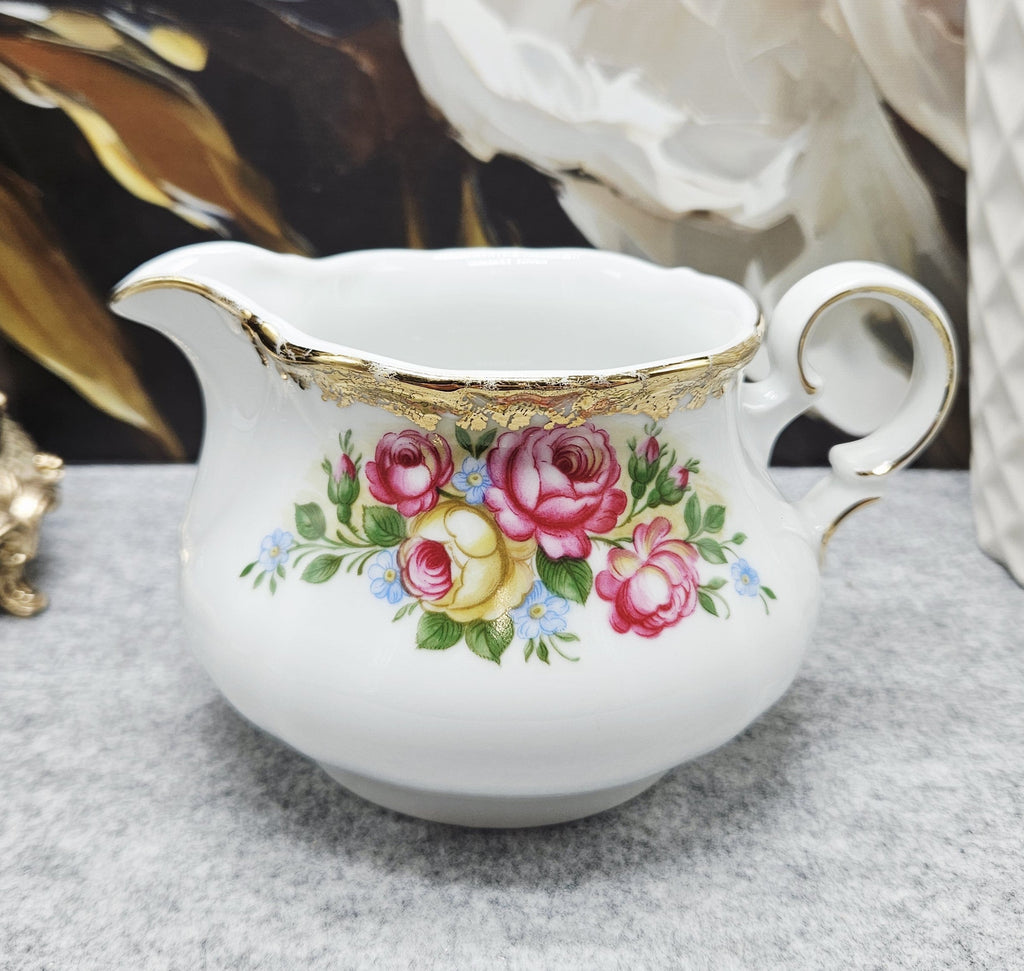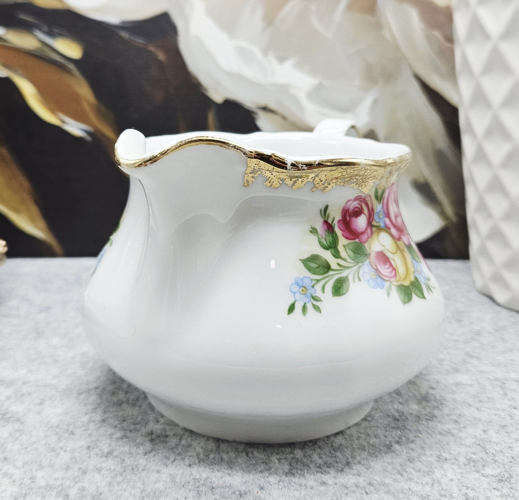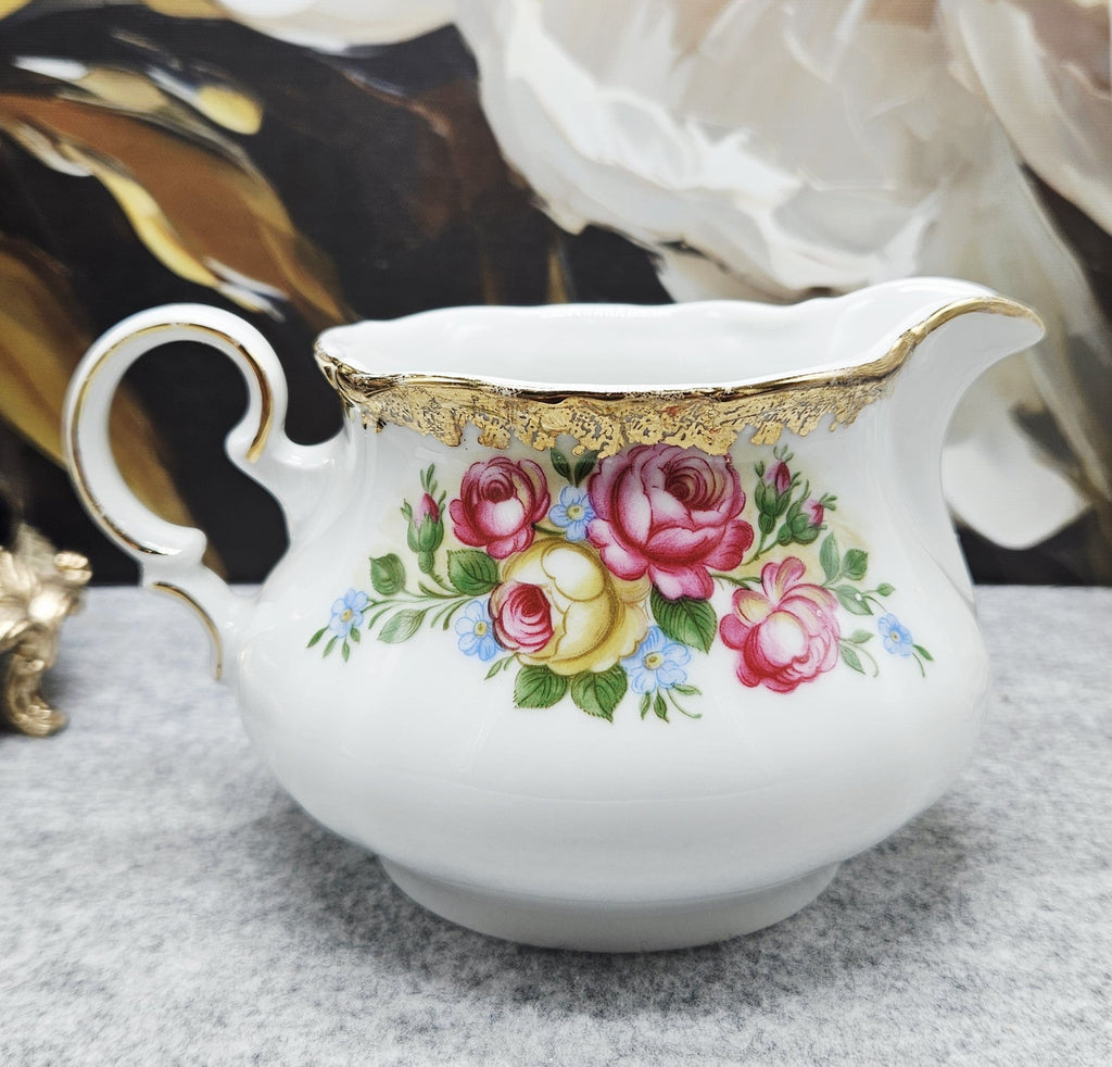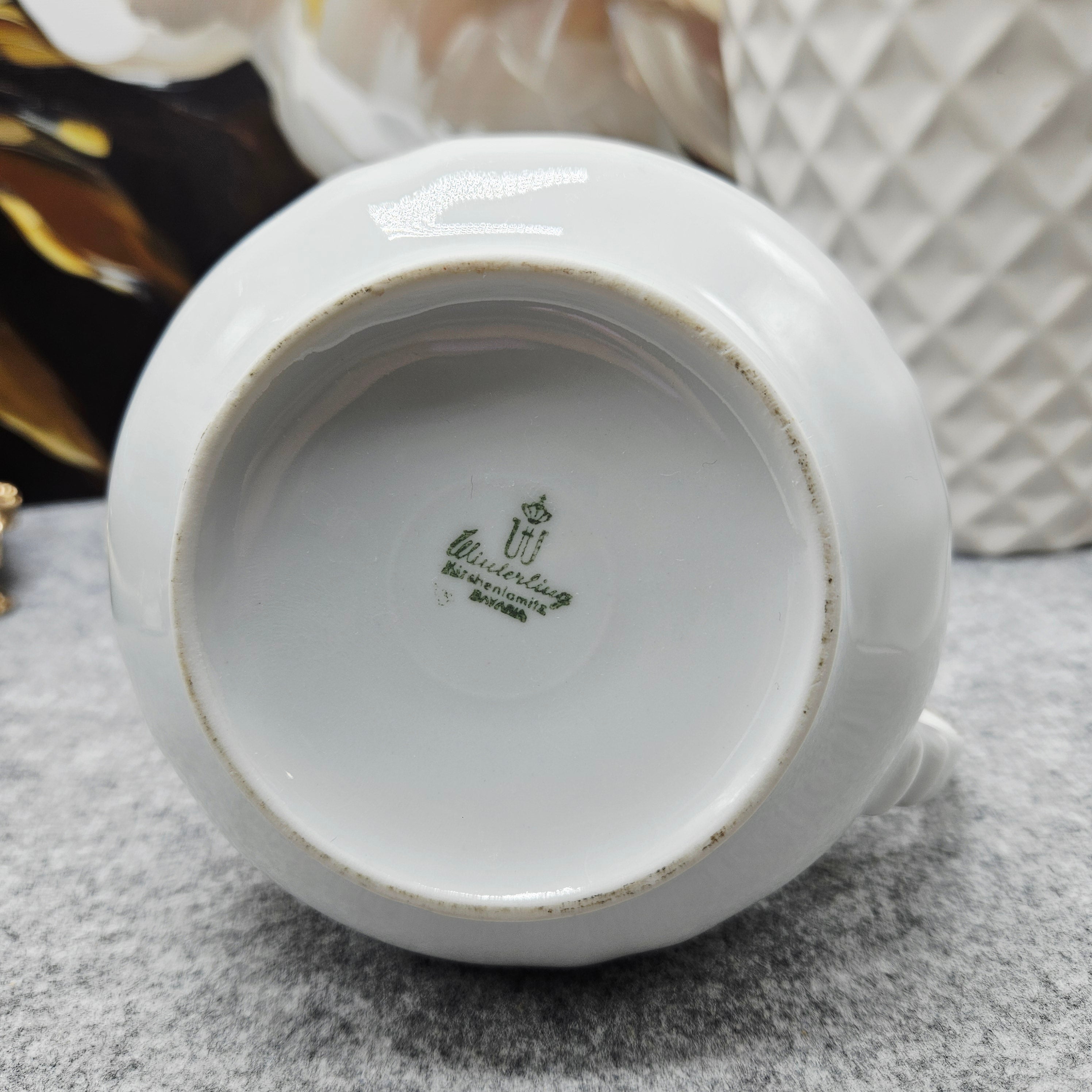 Das Dekor wird von romantischen Motiven aus Rosen, gelben und blauen Blüten dominiert, die typisch für die traditionelle Winterling-Ästhetik sind. Die elegante Form mit dem zierlichen Ausguss und dem geschwungenen Henkel unterstreicht die klassische Handwerkskunst des deutschen Porzellans.