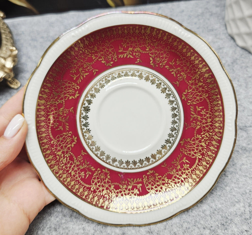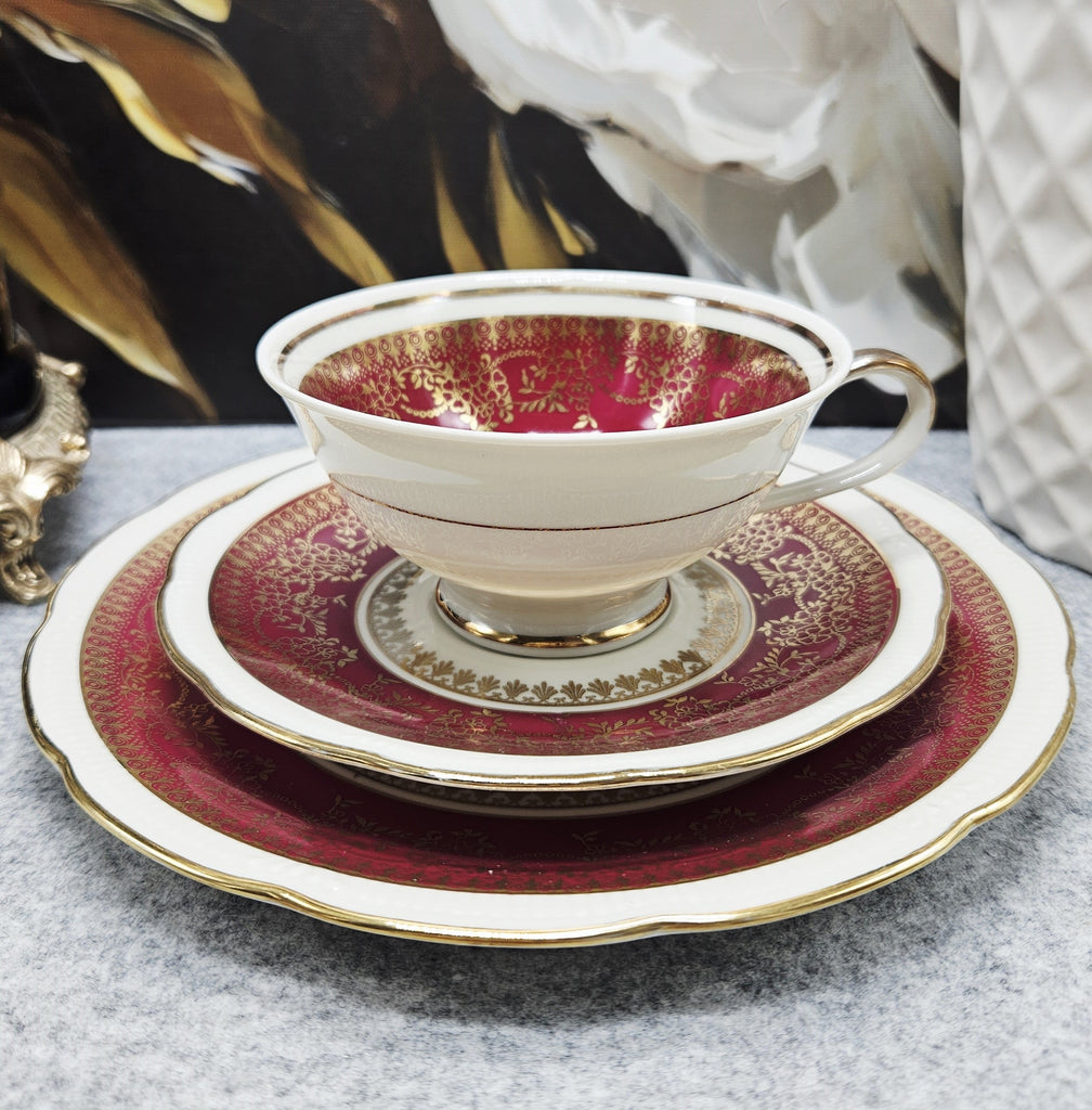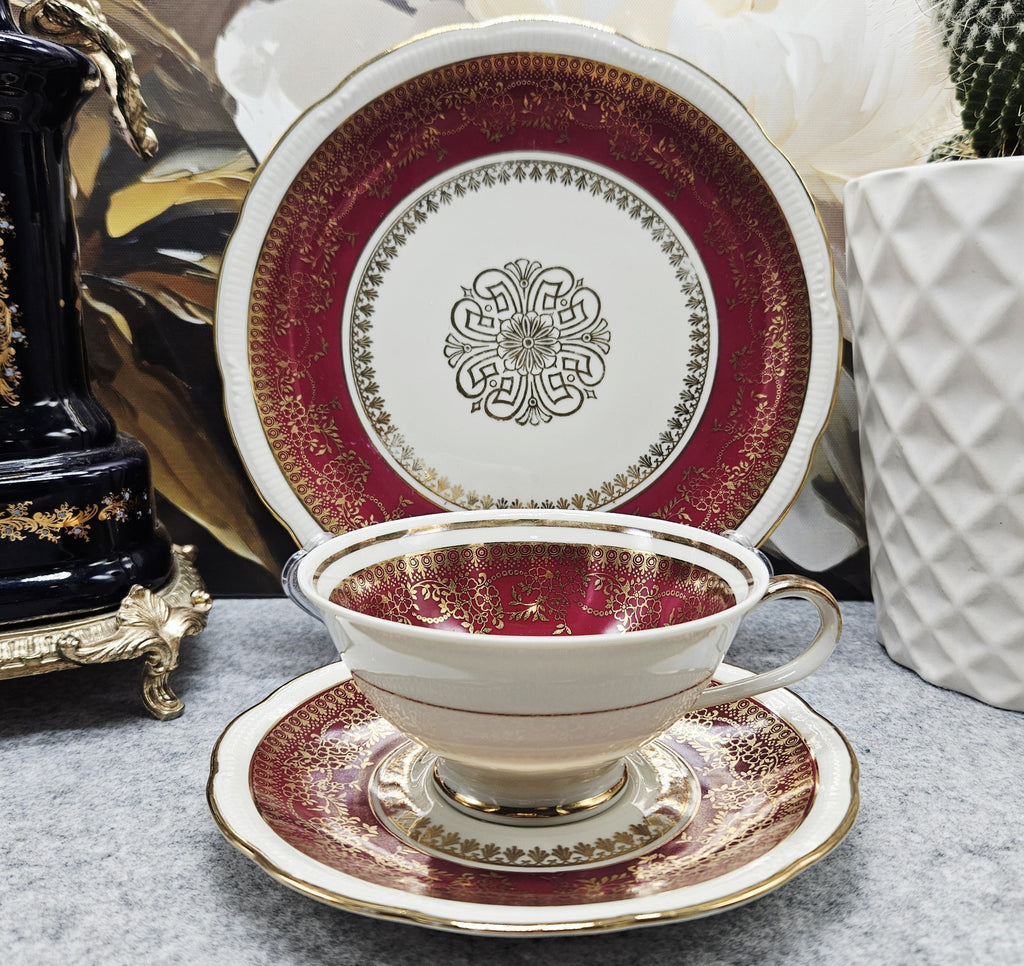Ein Porzellanset von außergewöhnlicher Schönheit, bestehend aus einer Tasse, einer Untertasse und einem Dessertteller. Dekoriert mit einem reichen burgunderroten Band, reich verziert mit Goldornamenten, mit zarten floralen Motiven auf der Innenseite und den Rändern. Die Innenseite der Tasse ist ebenfalls mit Golddekorationen verziert, die ihr eine luxuriöse und elegante Note verleihen.
