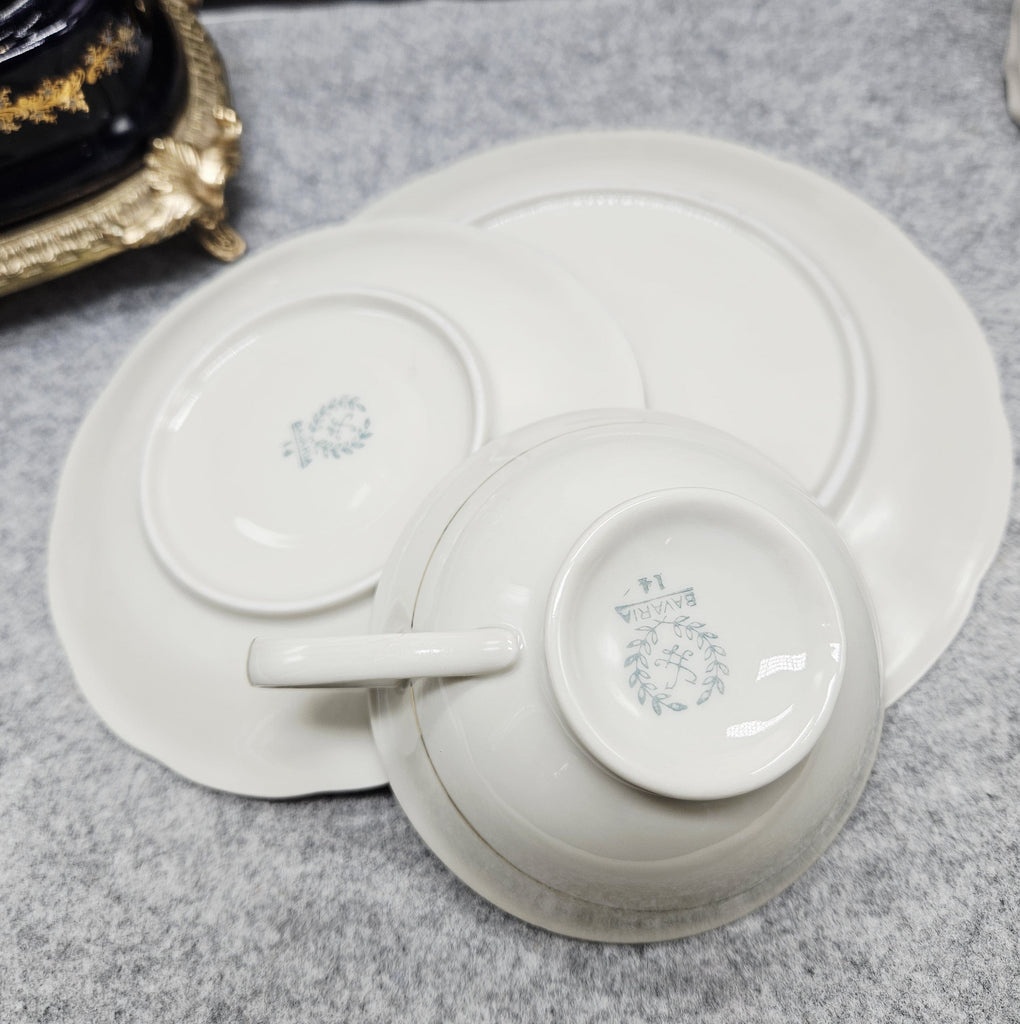 Die klassische Form mit sanft gewellten Rändern und die subtile Kombination von Weiß und Burgunderrot mit Vergoldung machen dieses Set zu einem besonderen Sammlerstück. Es eignet sich sowohl für den alltäglichen Gebrauch zu besonderen Anlässen als auch für die Innendekoration.