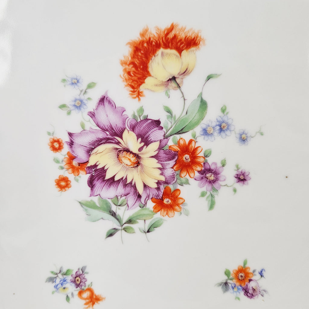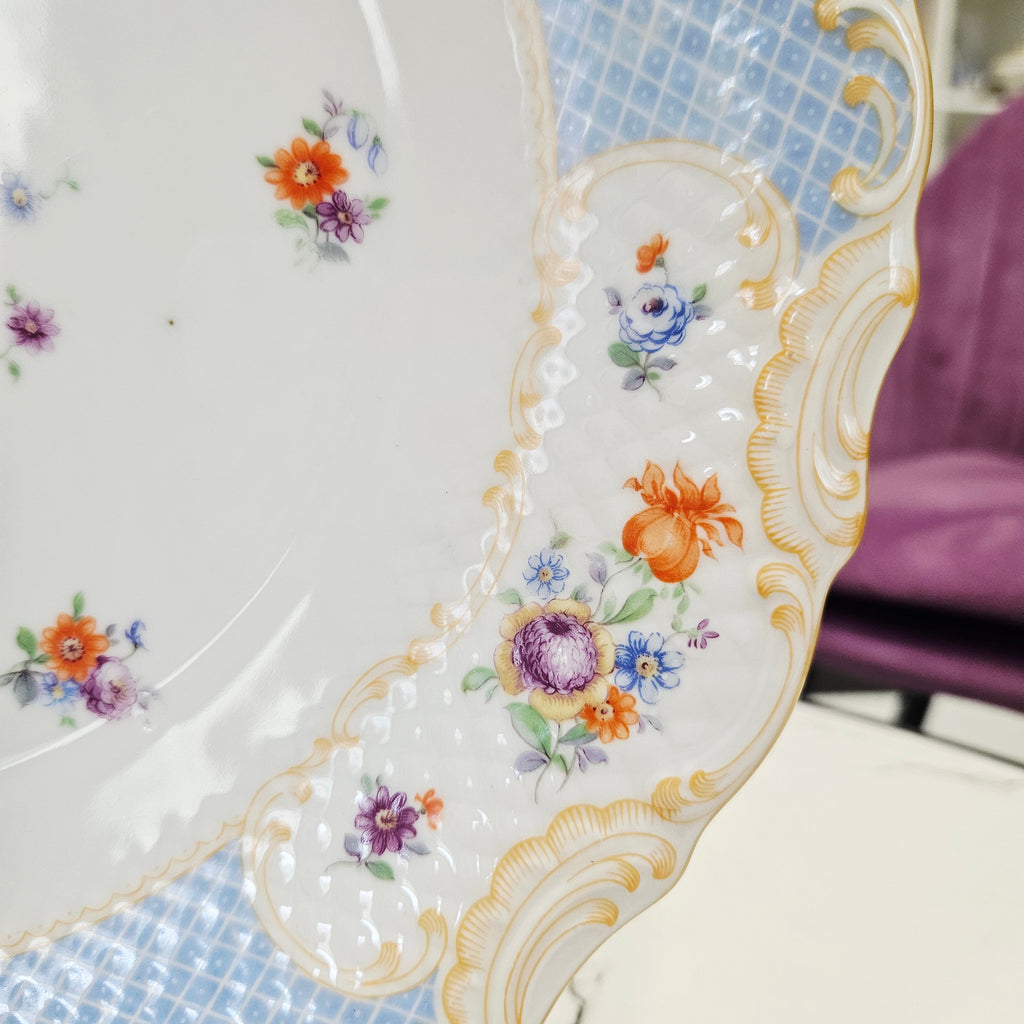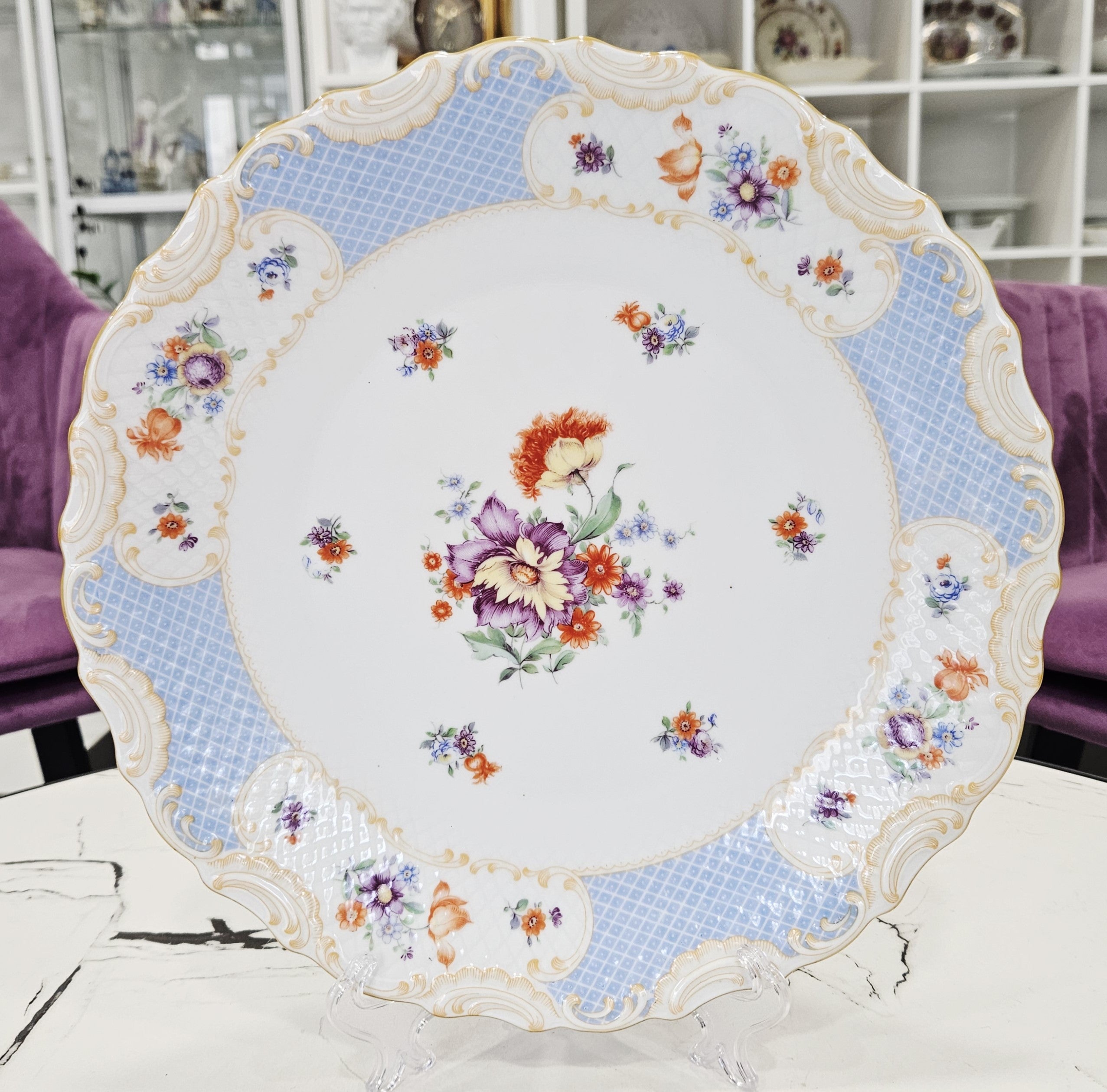 Der deutsche Porzellanteller Schumann Bavaria ist eine Kombination aus raffinierter Klassik und Eleganz. Er ist mit einem Blumenstraußmotiv in der Mitte und einem zartblauen geometrischen Hintergrund verziert, der mit gelblichen Ornamenten und geprägten Rändern verziert ist. Dieser Teller zeichnet sich durch seine sorgfältige Zeichnung, die zarten Farben und die für bayerisches Porzellan typische handwerkliche Präzision aus. Ein perfektes Sammlerstück oder Interieur-Akzent, der die Tradition und Qualität des deutschen Porzellans ausstrahlt.Maße: groß - ca. Ø 29,5cm. Zustand: ausgezeichnet, ohne Beschädigungen, minimale natürliche Altersspuren. (siehe Fotos)
