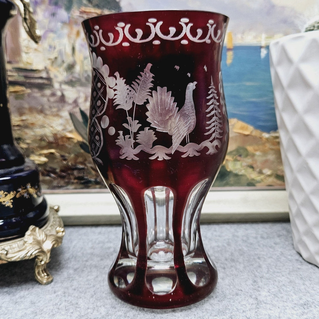 "Die rubinrote, handgeschliffene Vase von Egermann ist ein Beispiel für Eleganz und Raffinesse, hergestellt in der Tschechoslowakei in den 1940er Jahren.