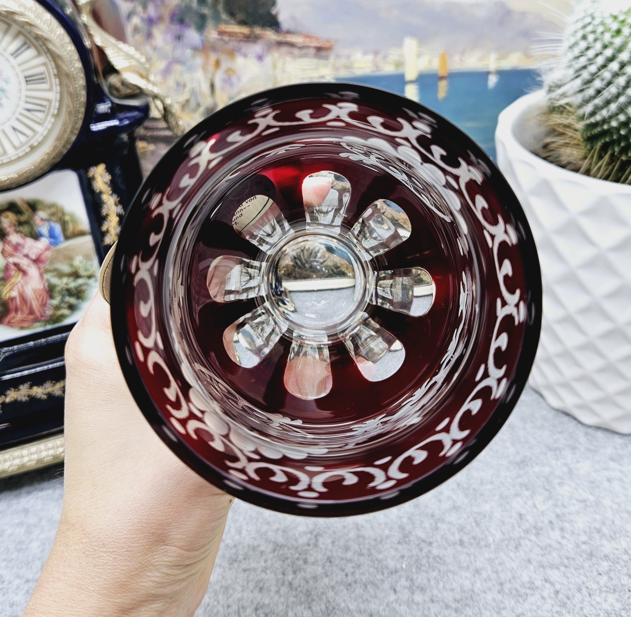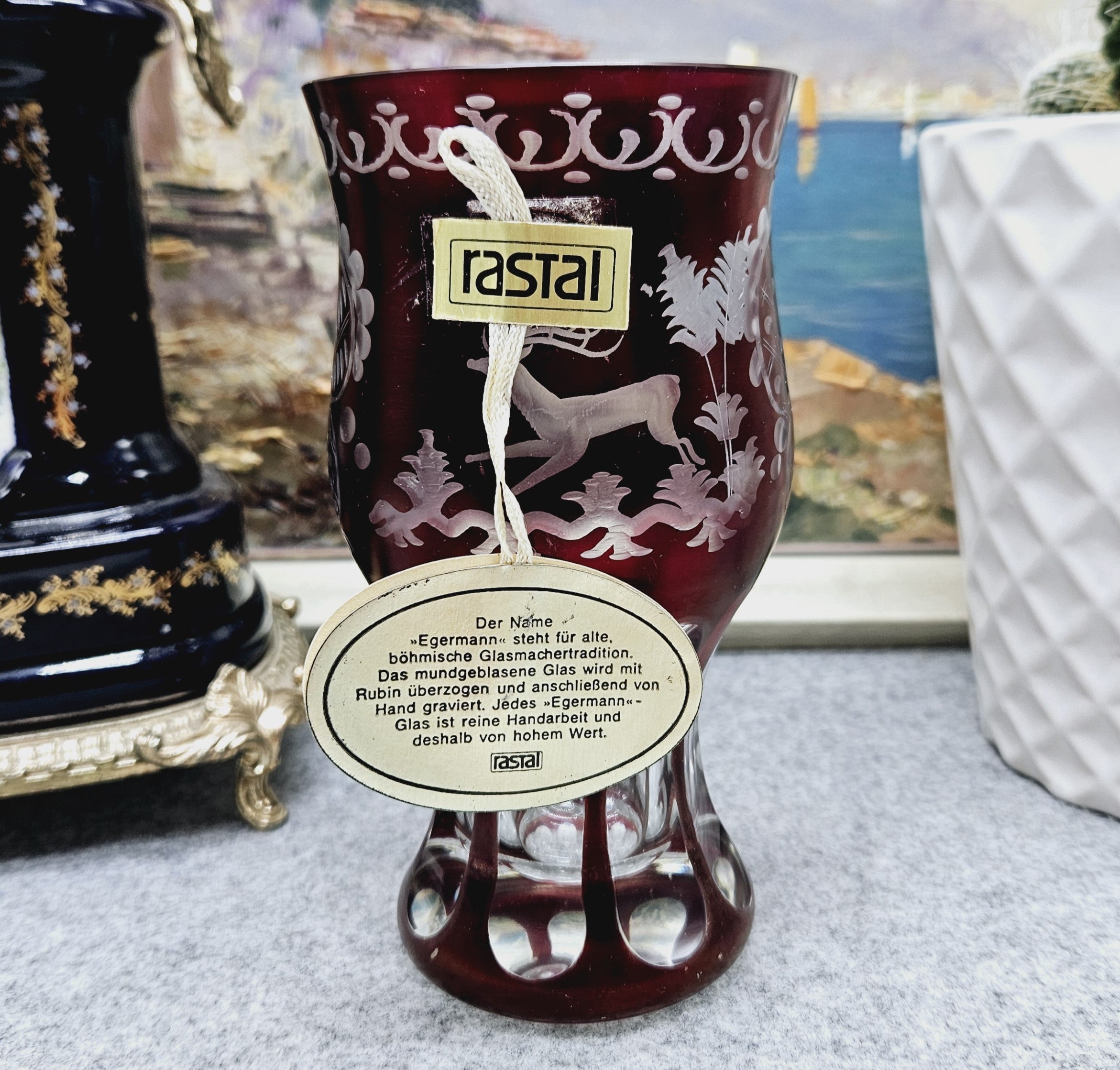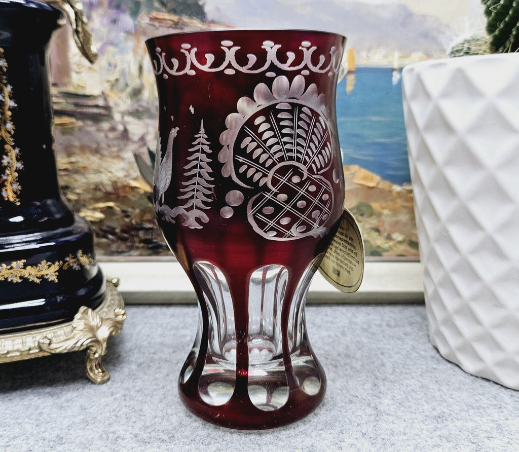 Diese Vase zeichnet sich durch ihre satte rote Farbe aus, die durch die einzigartige, für Egermann-Produkte typische Glasfärbetechnik entsteht. Jedes Detail ist von Hand geschnitzt, was diesem Stück eine besondere Kunstfertigkeit und Handwerkskunst verleiht. Die Vase spiegelt perfekt die Schönheit und die Traditionen der Glaswaren jener Zeit wider und ist nicht nur ein außergewöhnlicher Akzent für die Inneneinrichtung, sondern auch ein historisches Erbe, das die Handwerkskunst der tschechoslowakischen Glasherstellung verkörpert.