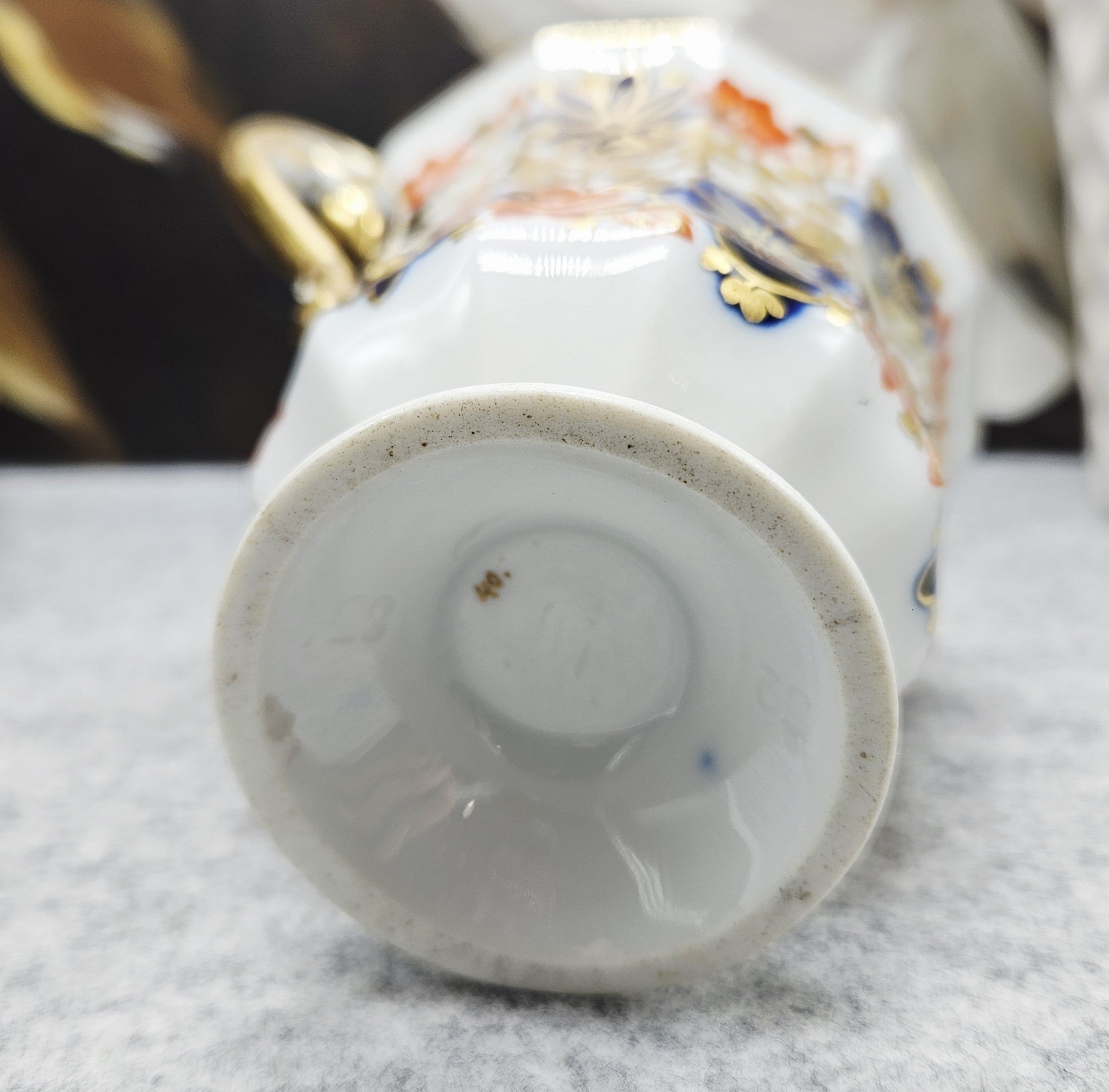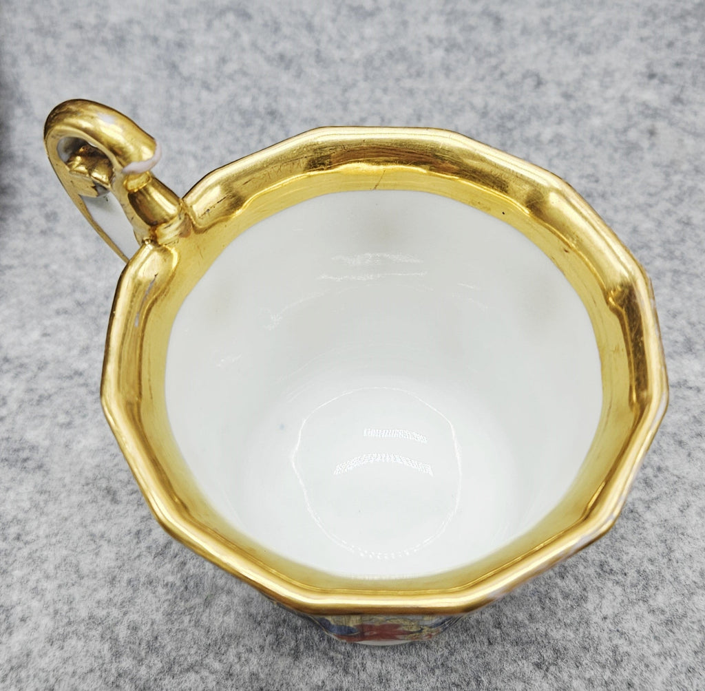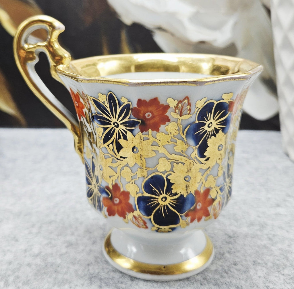 Vergoldete Kaffee-/Tee-Tasse aus Porzellan. Blaue und orangefarbene Blumen sind mit zarten Auktionsdetails verflochten, die einen luxuriösen Eindruck erwecken. Die Eleganz der Tasse wird durch den markanten Ausguss und die klassische Form noch verstärkt.