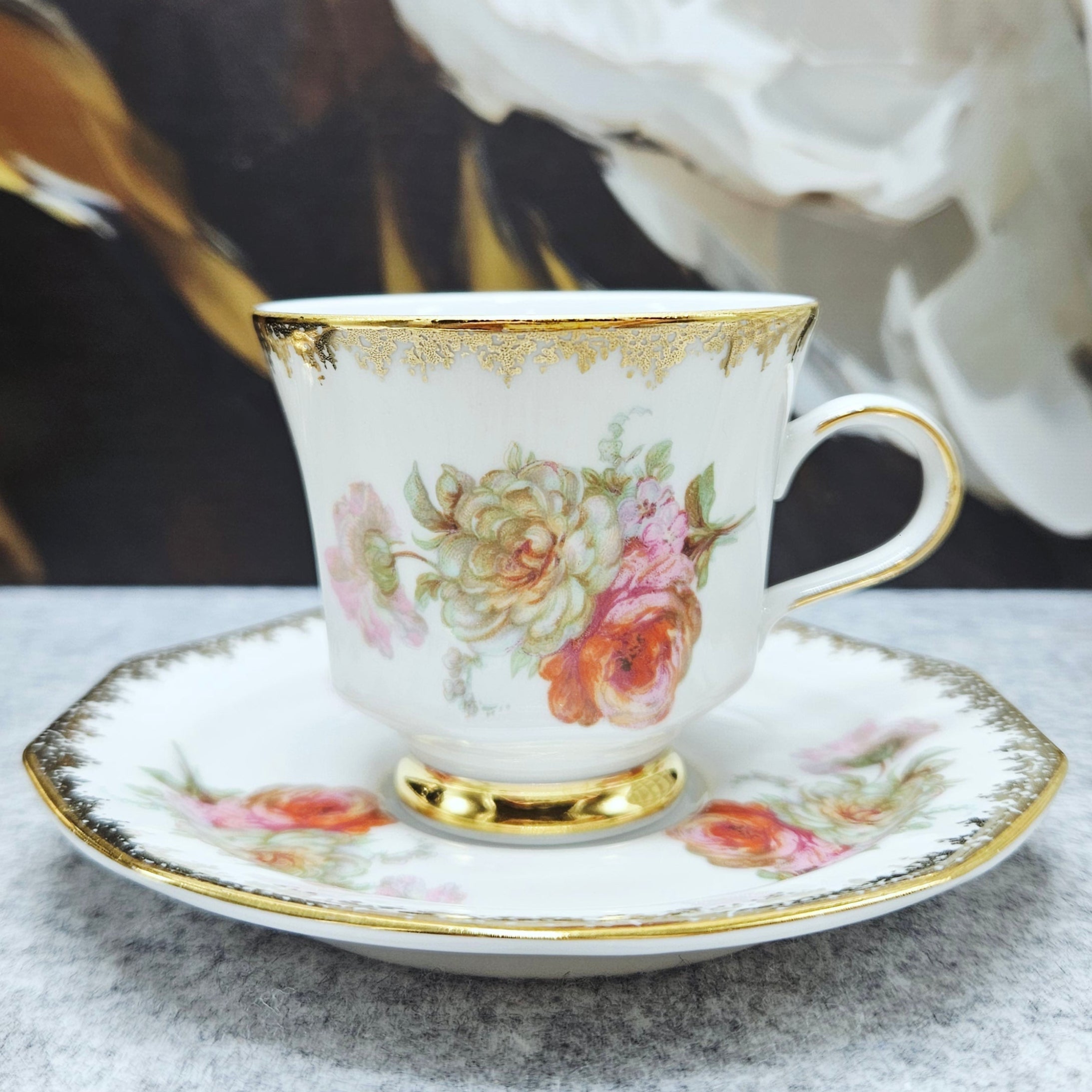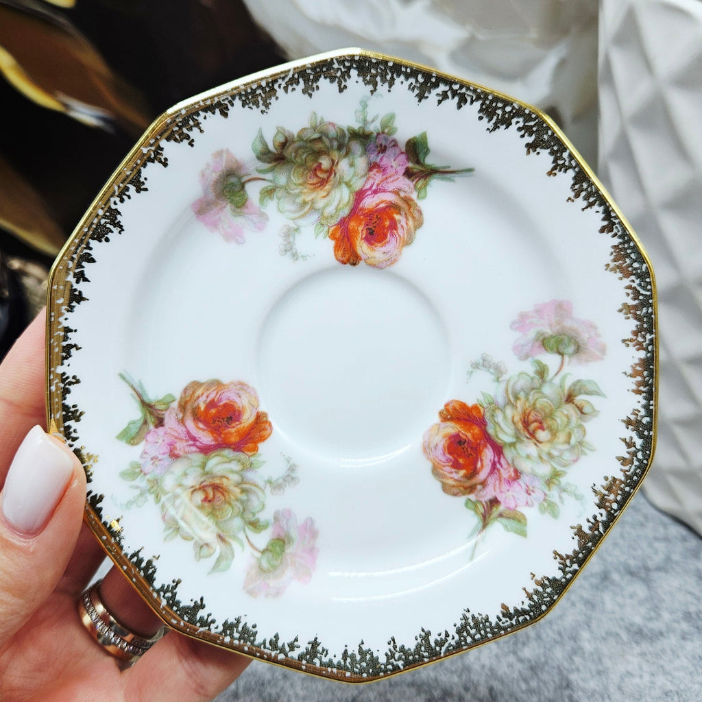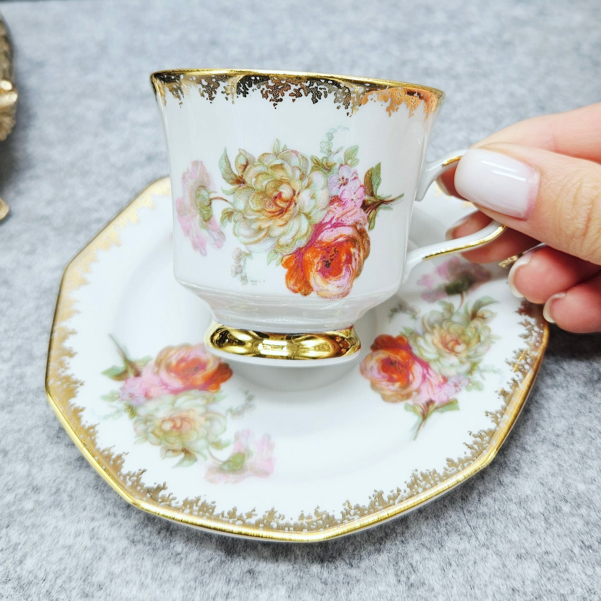 Diese exquisite Winterling Bavaria Porzellantasse mit Untertasse versprüht den Charme der alten Welt und romantische Zärtlichkeit. Pastellfarbene Rosenblüten - von zarten Rosatönen bis hin zu satten Pfirsichtönen -, deren natürliche Schönheit subtil im Aquarellstil wiedergegeben wurde, sind auf der hellen Porzellanoberfläche zu sehen. Der goldene Rand von Tasse und Untertasse, der mit durchbrochenen Motiven verziert ist, verleiht dem Ensemble einen Hauch von Luxus und Noblesse. Dieses Set wird nicht nur bei jedem Kaffeegenuss das Auge erfreuen, sondern auch ein raffiniertes Einrichtungsdetail oder ein wertvoller Teil einer Sammlung werden.
